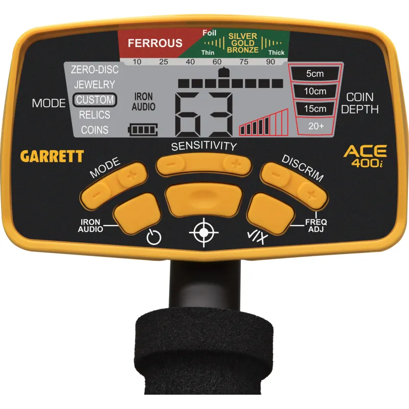 Garrett ace 400i Demir Sesi: Kullanıcının ayırt edilebilen demir hedefleri duymasına ve orta seviyedeki sinyal seviyesini değiştirmesine izin verir.